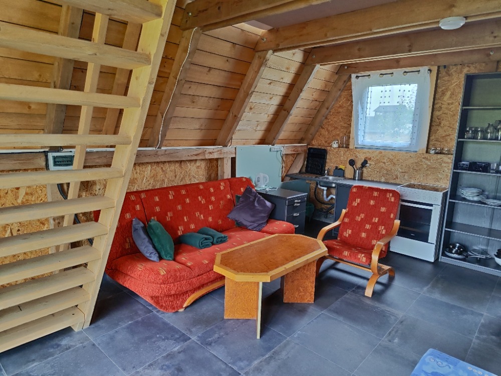 Součástí každé chaty je praktická kuchyňka se sporákem, varnou konvicí, lednicí a kompletním nádobím, takže si můžete pohodlně vařit jako doma. Před chatou najdete příjemné posezení, ideální pro ranní kávu, večerní grilování nebo jen tak k odpočinku po výletě. Díky blízkosti přírody uslyšíte místo ruchu města jen šumění stromů a zpěv ptáků.
